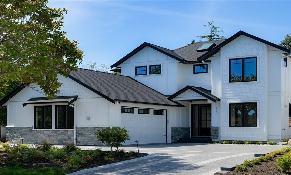 It’s becoming common to see houses with two complementary siding tones — for example, main siding in a neutral colour with darker panels or boards in gables, or accent bands. Mixed siding styles (e.g. horizontal lap + board & batten) help break up large façades.